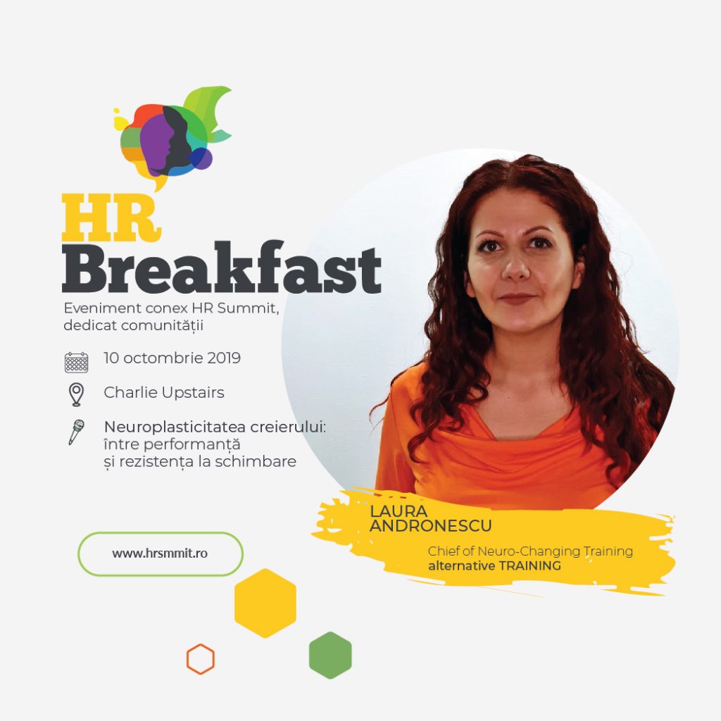 În cadrul întâlnirii HR Breakfast din 10 octombrie vă propunem ca timp de 1.5 ore să experimentați o mică parte din conținutul acestui program, împreună cu o sesiune de Q&A, pentru a vedea cum ne putem susține angajații să aplice ce învață la training, să accepte mai ușor schimbările propuse de procesul de învățare și să putem vedea returnarea investițiilor pe care le facem în training.